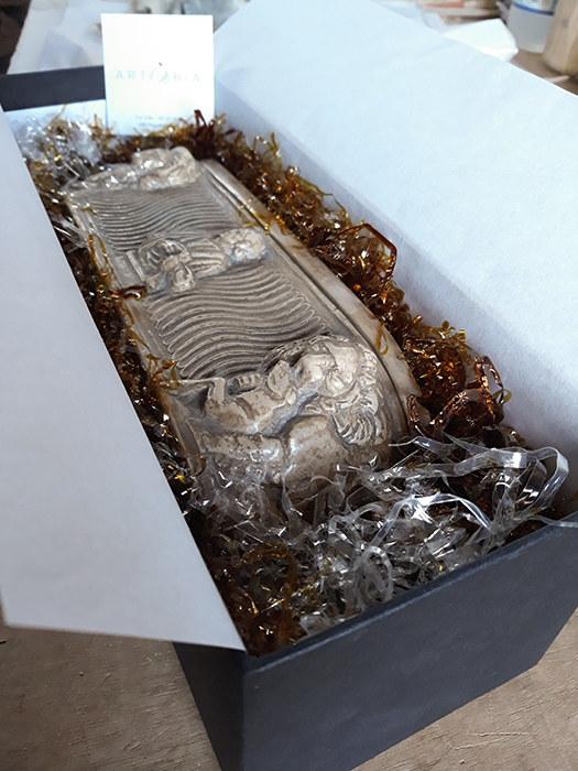 La Isabel i els seus companys de feina celebràren la jubilació d’una companya i amiga. Vinculats al món de la història i l’arqueologia clàssica, trobàren en aquesta rèplica del formidable sarcòfag dels Lleons, de la Necròpolis Paleocristiana de Tarragona, el millor regal de comiat. Personalitzaren l’obsequi amb una placa que col·locàrem a la part posterior de la peça i on pogueren expressar-li els seus millors desitjos per la nova etapa vital que començava.