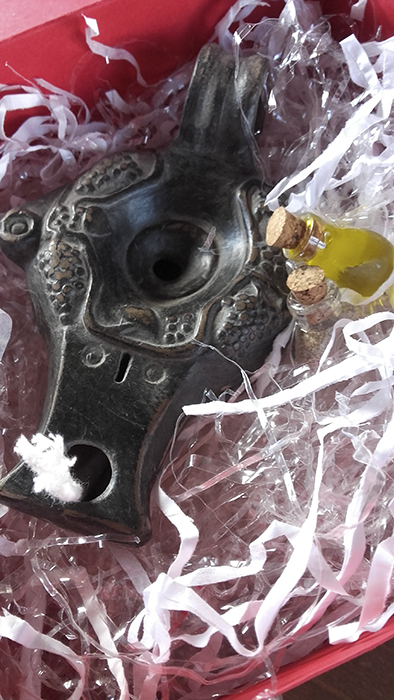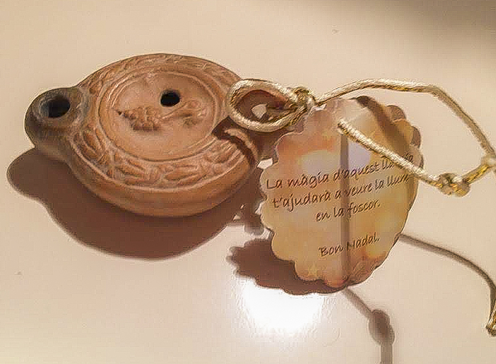 L’Associació Nuclear Ascó-Vandellós II va decidir obsequiar als seus convidats, amb aquestes reproduccions de llànties de Tarragona. A l’interior de la capsa hi afegirem una ampolleta d’oli per encendre la llàntia i una ampolleta de sorra del Mediterrà; una petita llicència poètica perquè els visitants, arribats d’arreu del món, s’emportessin a casa un bocí de la nostra escència.